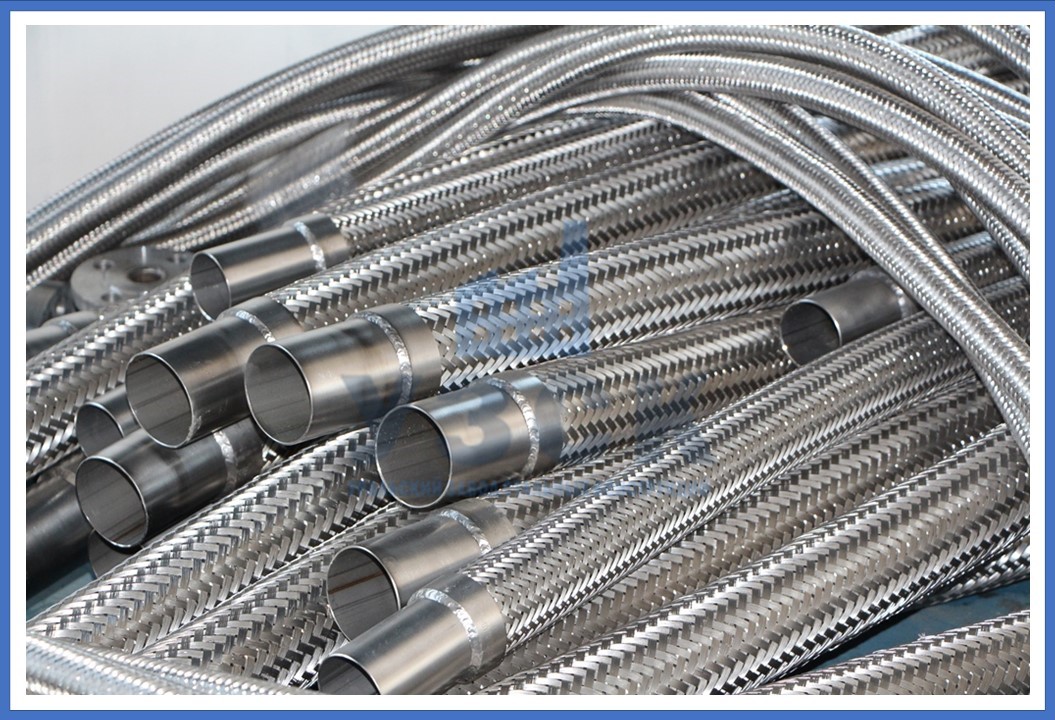 - Оплетка. Является одновременно покрытием и защитой от влияния факторов внешней среды, а также внутреннего давления в трубопроводах. Для создания оплетки используют металлическую проволоку толщиной от 0,3 мм, количеством нитей в пряди не менее 6, но не более 12. Перекрытие поверхности оплеткой составляет от 60 до 100% всего изделия.