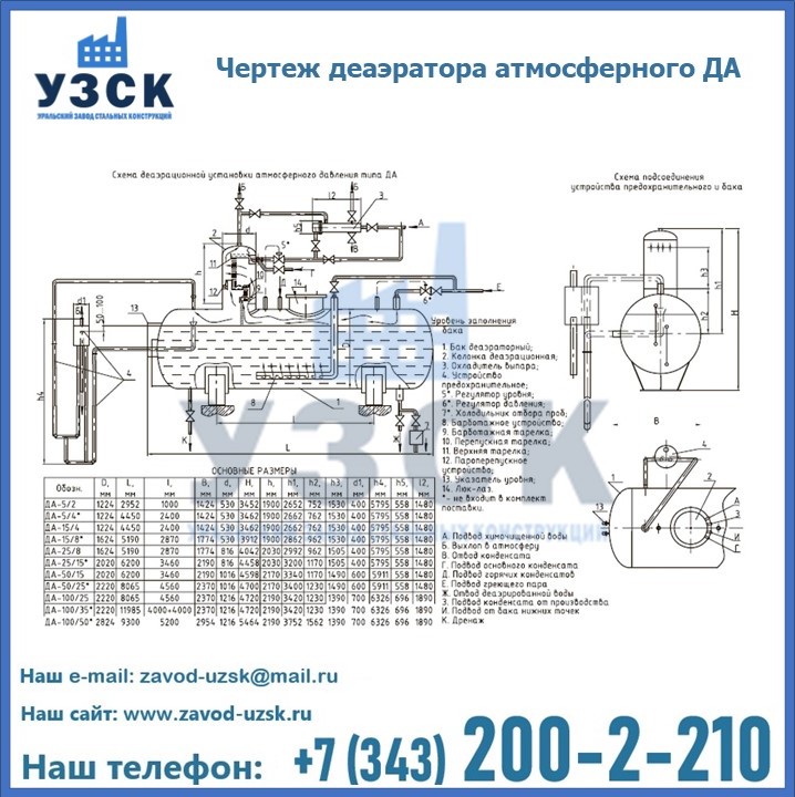 Приобрести качественное оборудование, в том числе, деаэраторы ДА, можно в компании УЗСК в Костроме. Мы предлагаем долговечную и надежную продукцию по приемлемой цене. Заказать и купить деаэраторы или другие изделия высокого качества можно через сайт Уральского Завода Стальных Конструкций, или позвонив по указанному в разделе «Контакты» телефону.