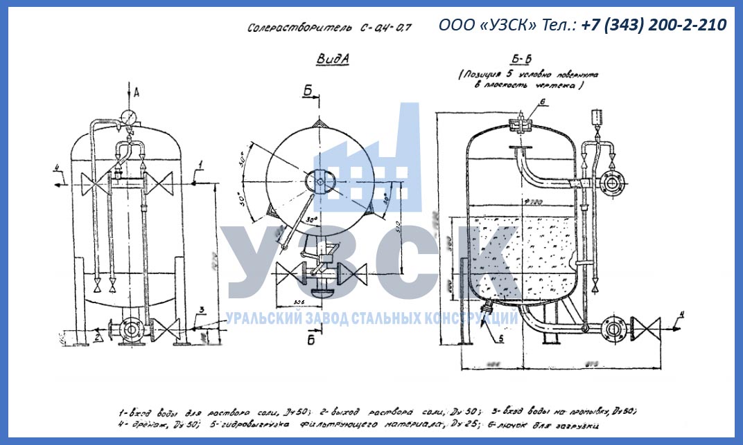 Солерастворитель С-0,4-0,7 – бак диаметром 700 мм для приготовления и очистки регенерационных растворов соли и сульфата аммония от механических примесей. Данные растворы необходимы для регенерации катионитных фильтров ФИПа.